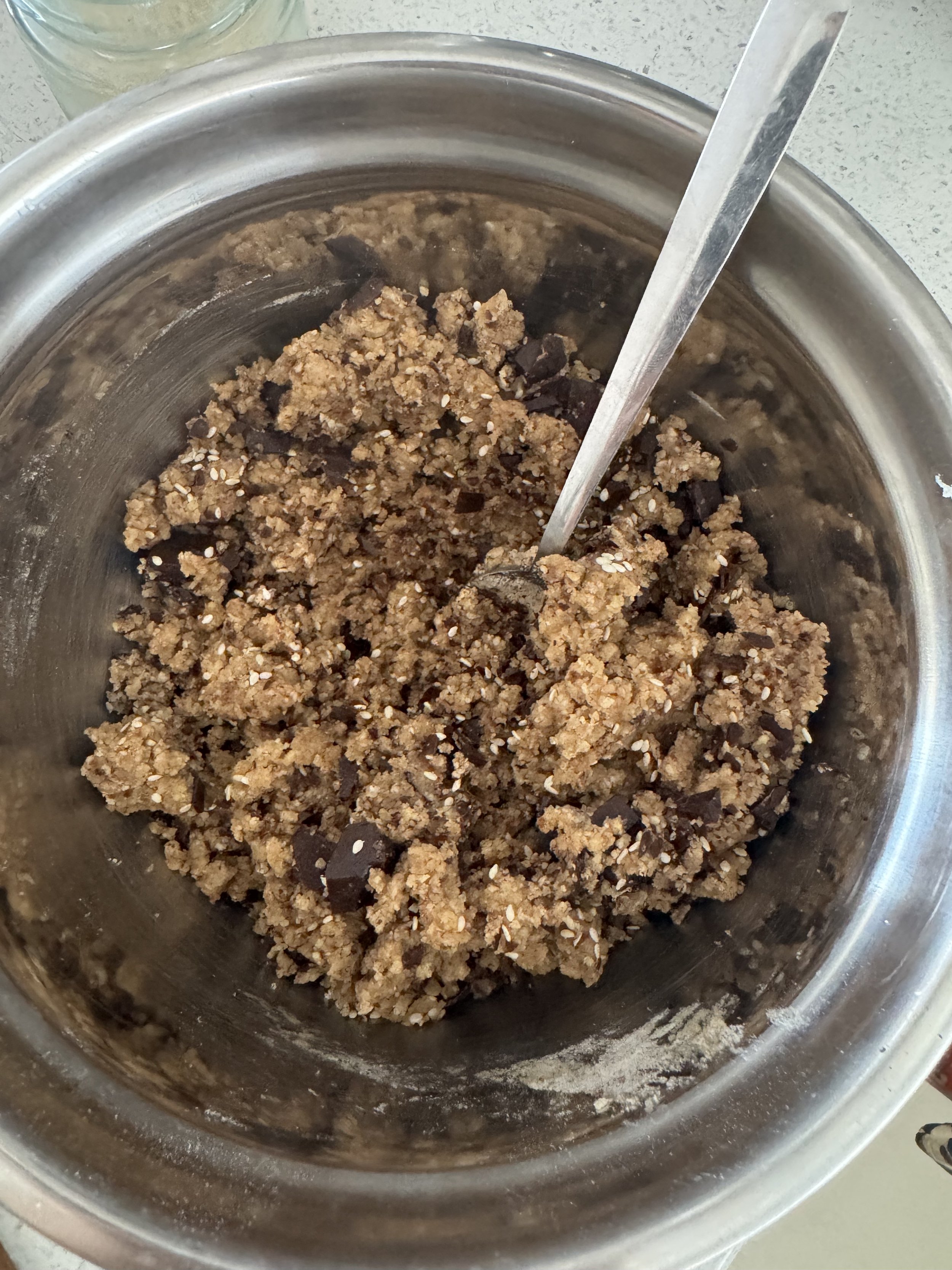 Fold through the chocolate and sesame seeds.